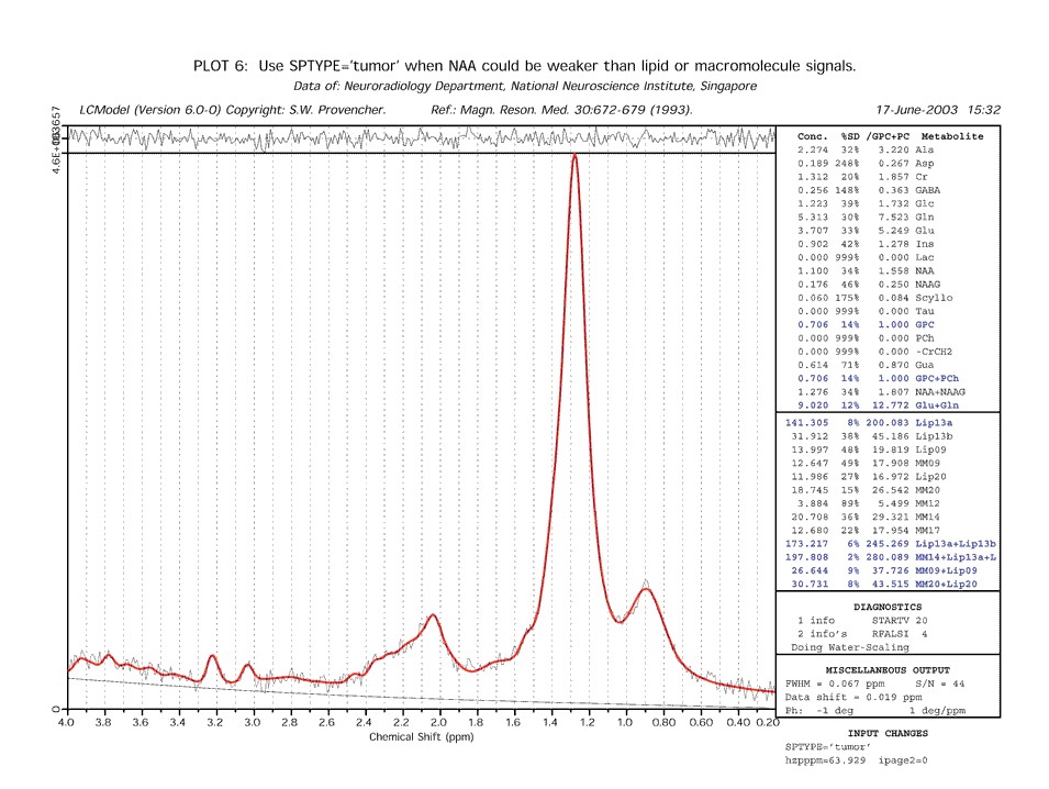 LCModel はMRI装置の1H MRS(PressまたはSteamシークエンス)から代謝産物の定量解析を行うソフトウェアです。代表的なMRメーカーのrawデータの読み込みに対応 しており、スペクトルを自動処理(FT, 位相補正等)し、カーブフィットした後に、MR装置、TE毎のBasis-setデータと比較し、代謝物毎のピーク分離で計算されるピークエリアから各代 謝産物の定量(水分を基準としたmM(mmol/L)濃度、または対Creatine比)計算を自動的に行います。分析結果はMRスペクトル、代謝産物の 名称、濃度、標準偏差(SD)の情報と共にポストスクリプト(PS)ファイル、CSVファイル、TXTファイルへ出力されます。オプション設定で指定代謝 物のピーク分離解析結果を出力することもできます。また解析後プロセス用のシェルスクリプトを変更してPSファイルからの画像変換、集計などをカスタマイ ズできます。