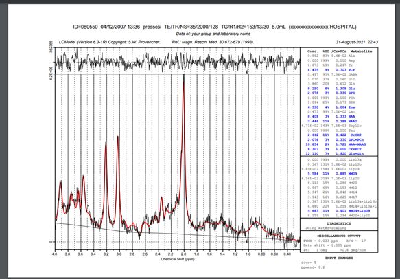 LCModel はMRI装置の1H MRS(PressまたはSteamシークエンス)から代謝産物の定量解析を行うソフトウェアです。代表的なMRメーカーのrawデータの読み込みに対応 しており、スペクトルを自動処理(FT, 位相補正等)し、カーブフィットした後に、MR装置、TE毎のBasis-setデータと比較し、代謝物毎のピーク分離で計算されるピークエリアから各代 謝産物の定量(水分を基準としたmM(mmol/L)濃度、または対Creatine比)計算を自動的に行います。分析結果はMRスペクトル、代謝産物の 名称、濃度、標準偏差(SD)の情報と共にポストスクリプト(PS)ファイル、CSVファイル、TXTファイルへ出力されます。オプション設定で指定代謝 物のピーク分離解析結果を出力することもできます。また解析後プロセス用のシェルスクリプトを変更してPSファイルからの画像変換、集計などをカスタマイ ズできます。